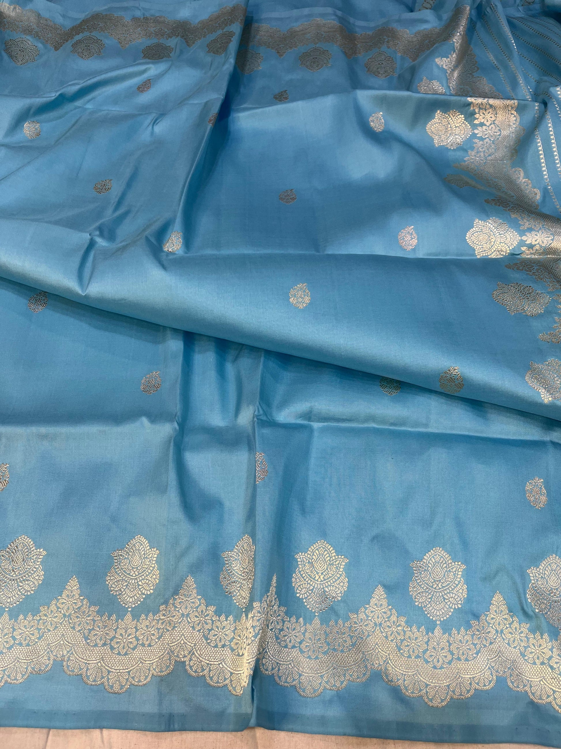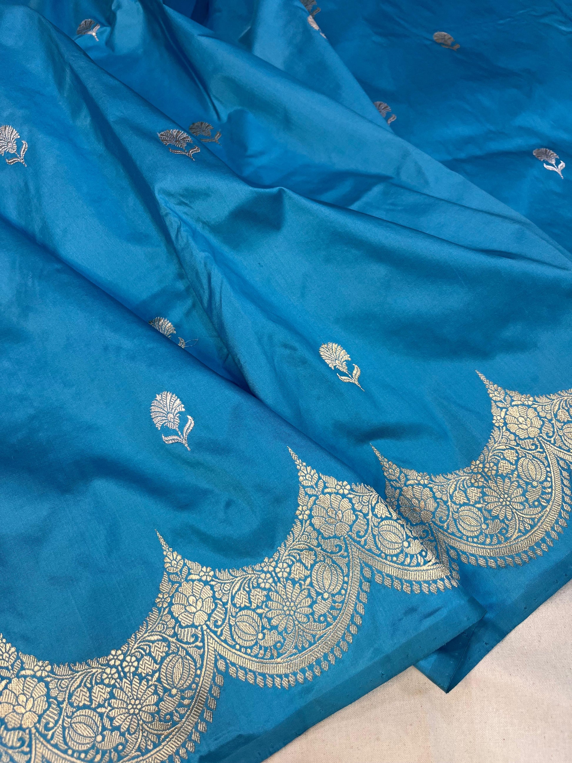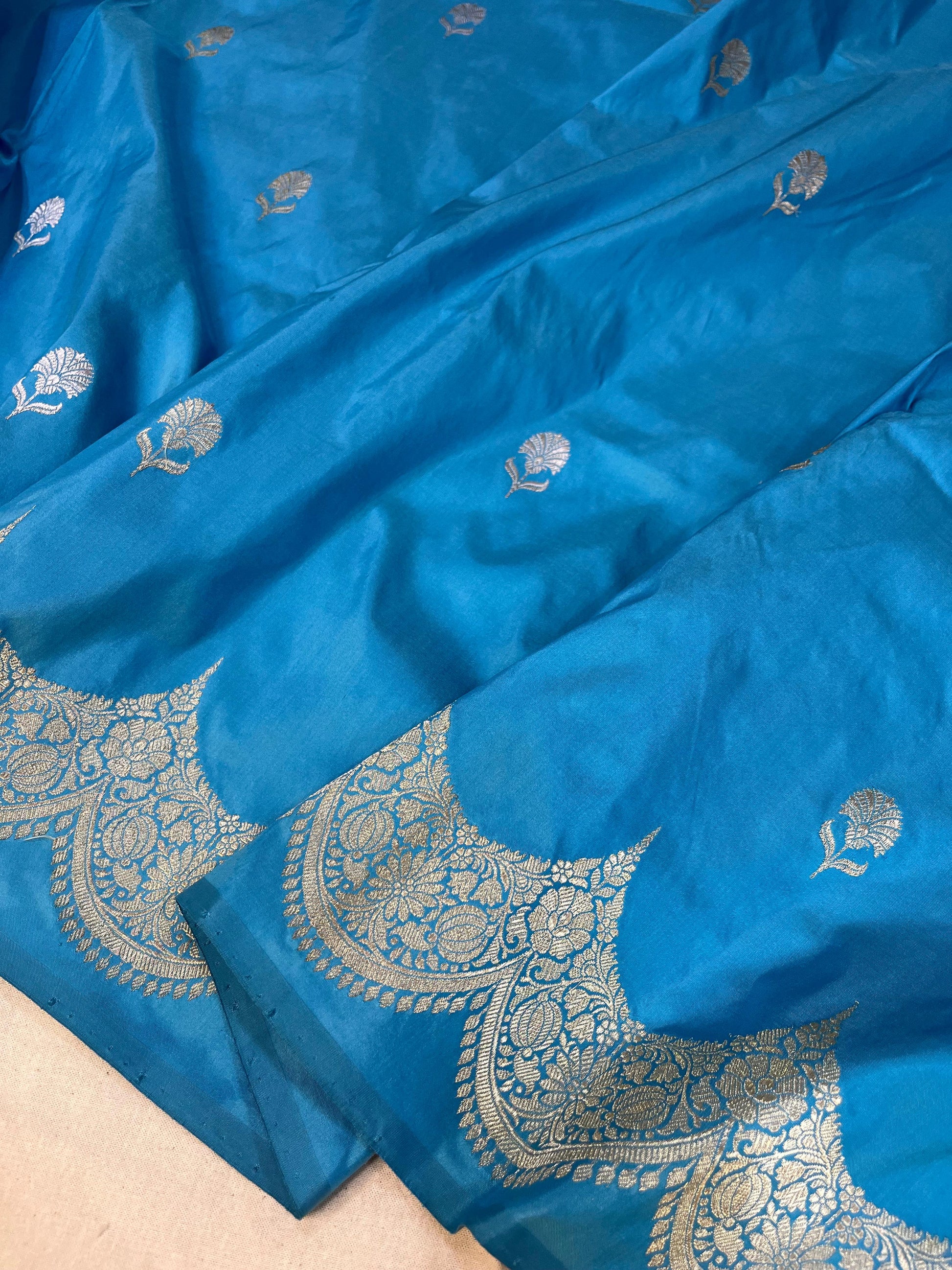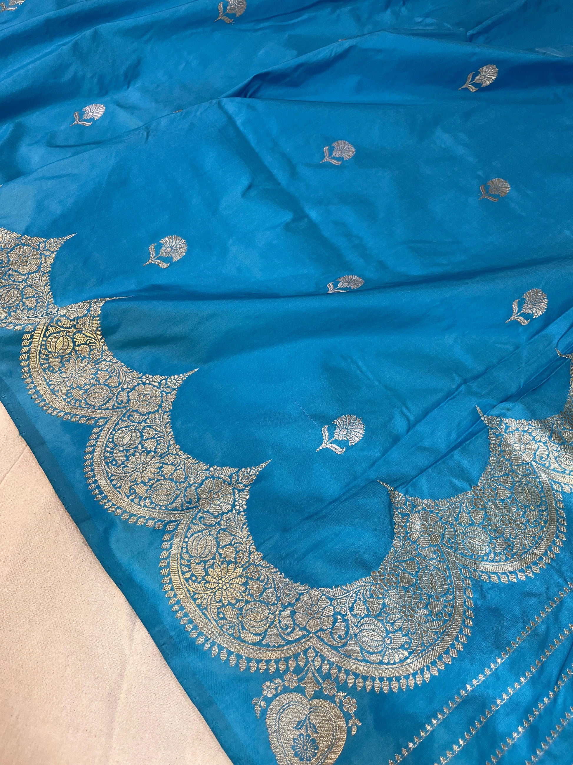 Pure banarasi katan silk handloom sare. Kadhuwa weave, scallop design weave border, golden n silver zari booties, with plain  blouse piece.
