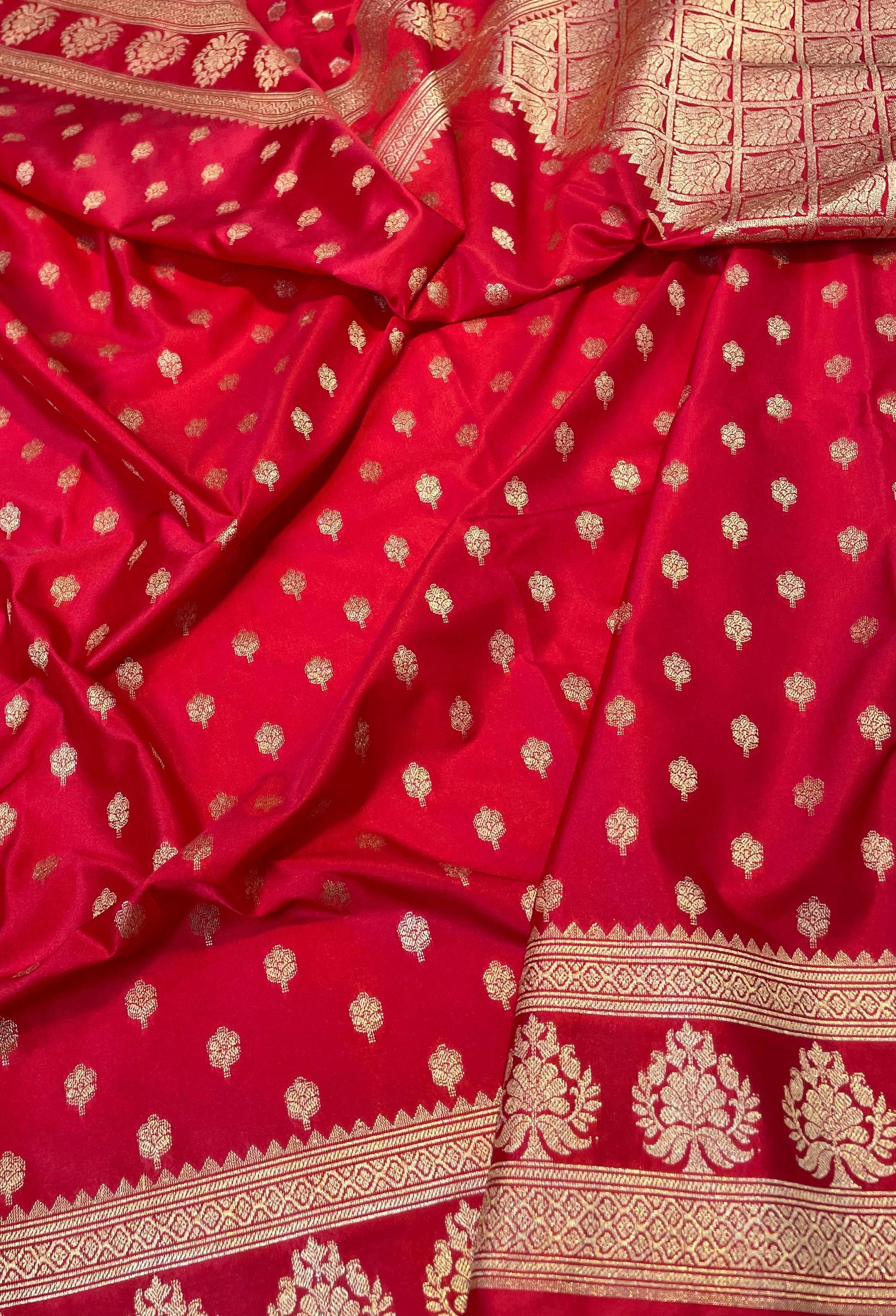 Beautiful Banarasi Mashru Silk Handloom Saree with pure zari weaving. This saree has a elegant shine. It’s lightweight, buttery soft, and drapes nicely — perfect for weddings and parties.