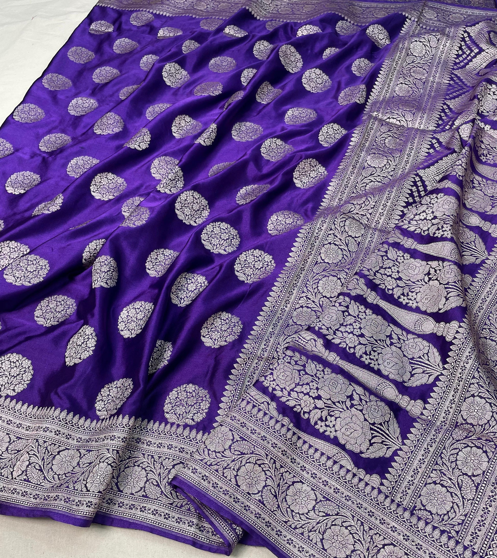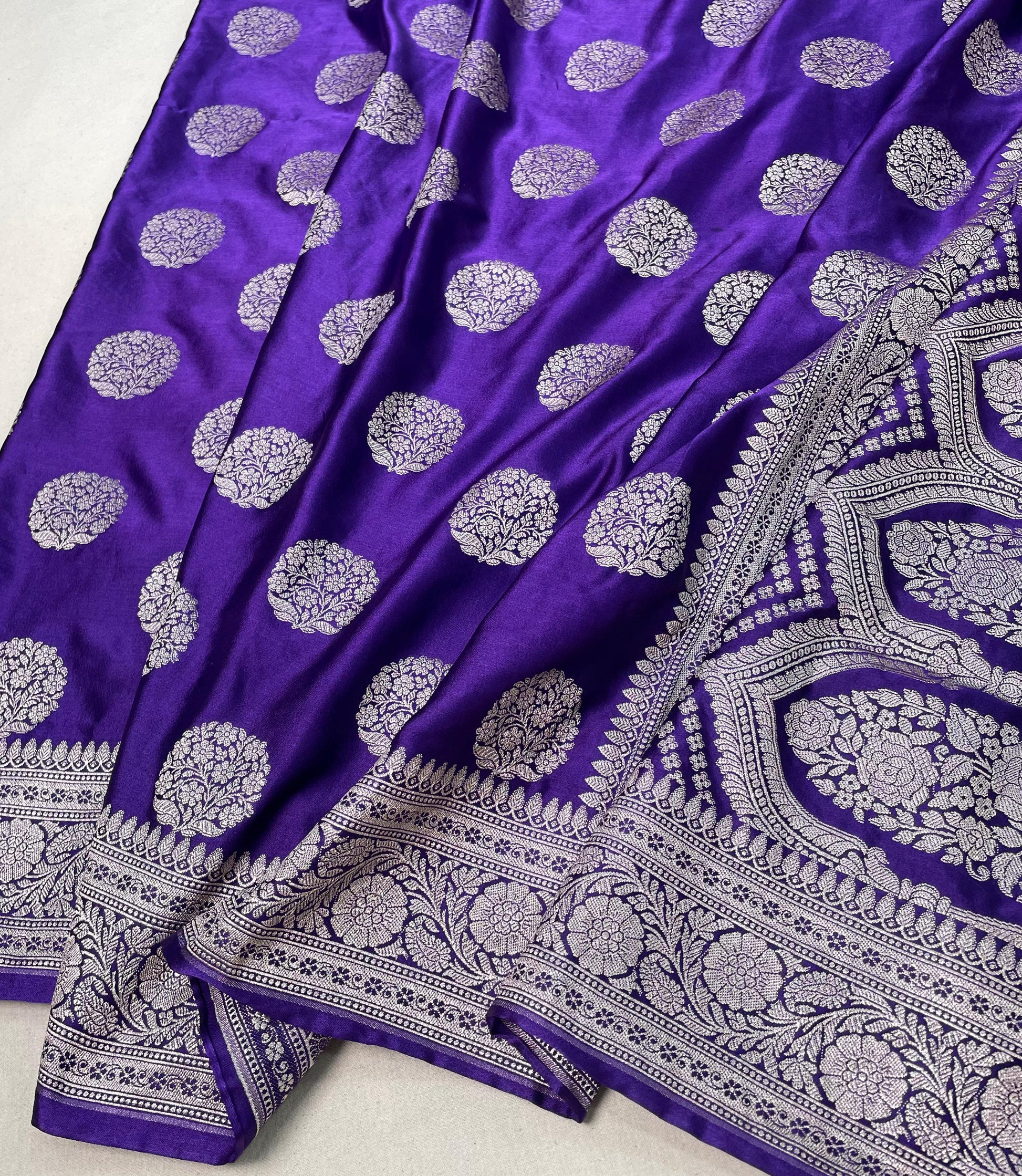 Beautiful Banarasi Mashru Silk Handloom Saree with pure zari weaving. This saree has a elegant shine. It’s lightweight, buttery soft, and drapes nicely — perfect for weddings and parties.
