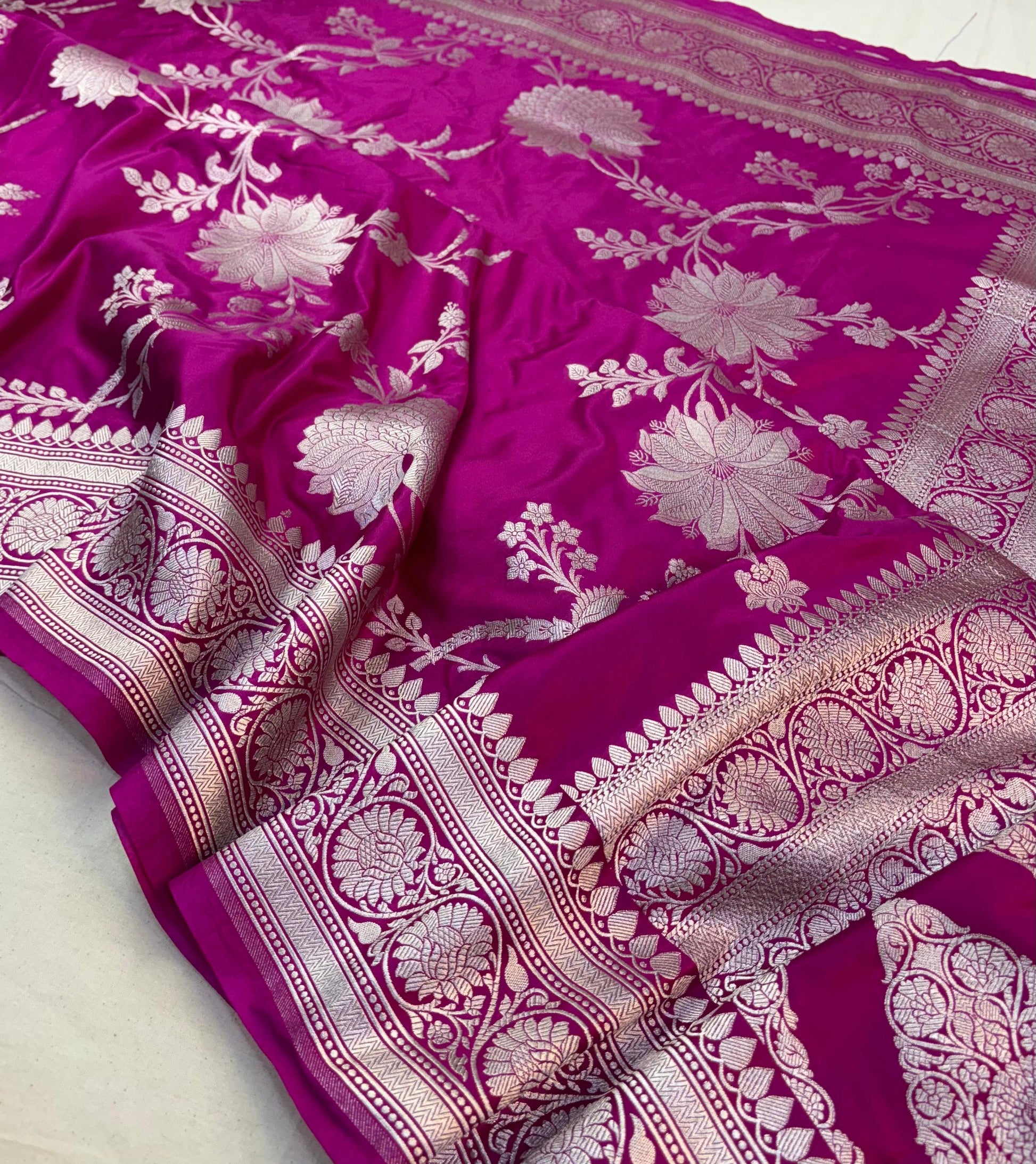 Beautiful Banarasi Mashru Silk Handloom Saree with pure zari weaving. This saree has a elegant shine. It’s lightweight, buttery soft, and drapes nicely — perfect for weddings and parties.