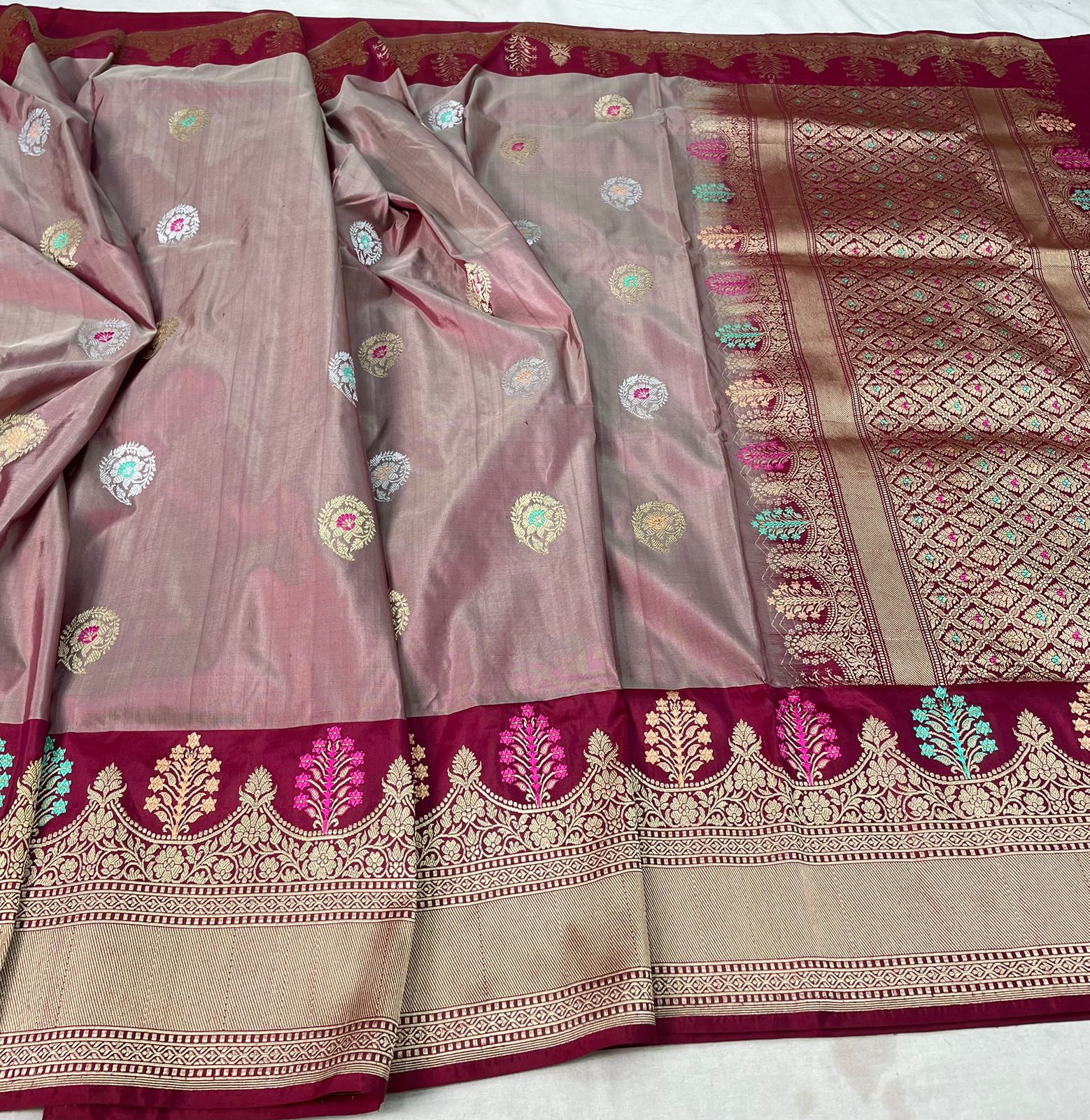 Pure banarasi dual warp katan  silk handloom saree, kadhuwa weave vibrant colour Meena booties design, golden n silver zari, Tilffi Paithani border n rich pallu with  blouse piece.