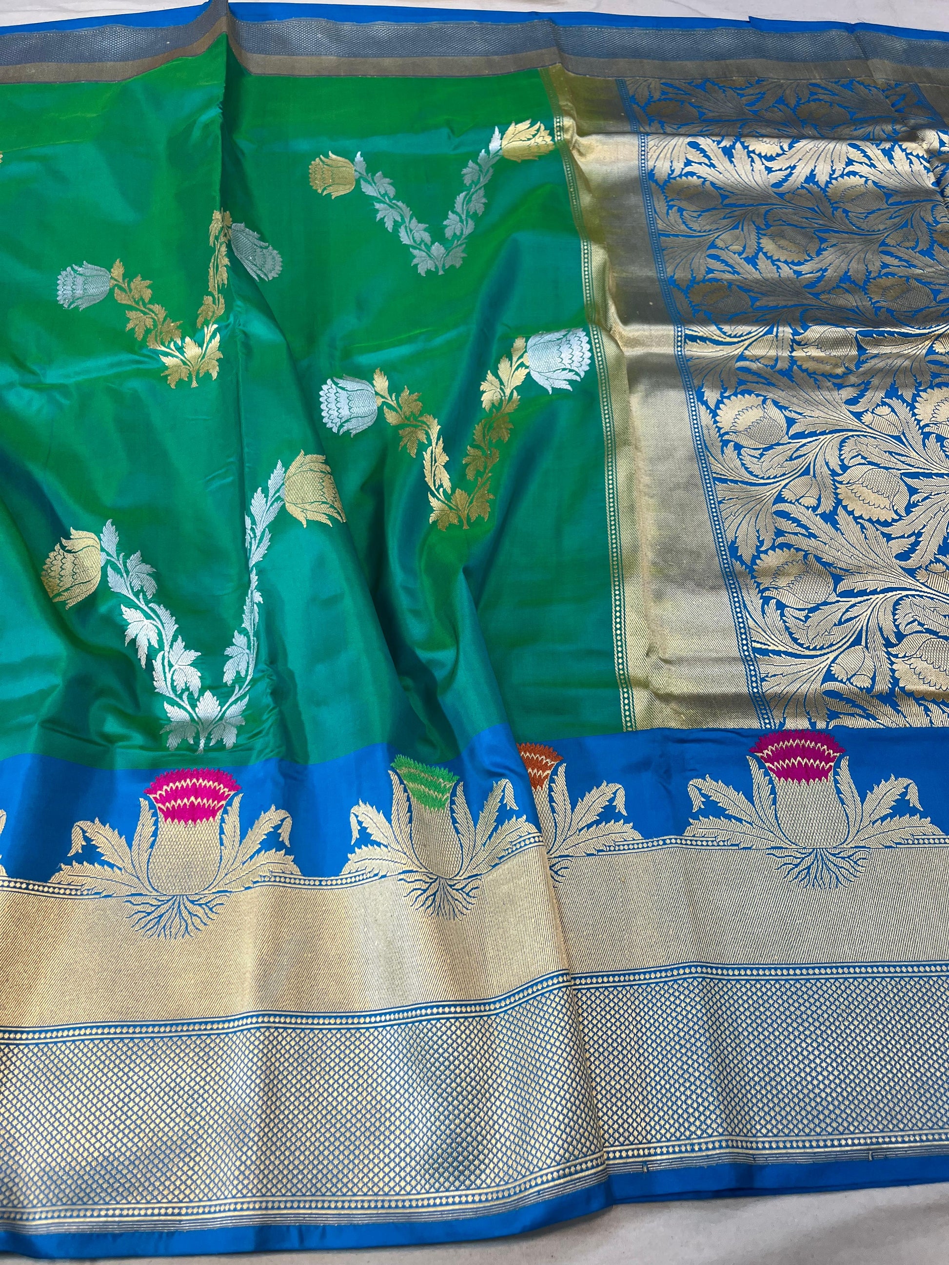 Banaras handwoven pure katan silk dual warp Saree, allover kaduwa weave butta with Lahriya design , Tilffi meena weave contrast kadhyal  border n rich pallu , with blouse pcs