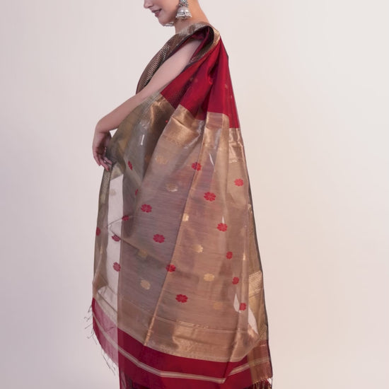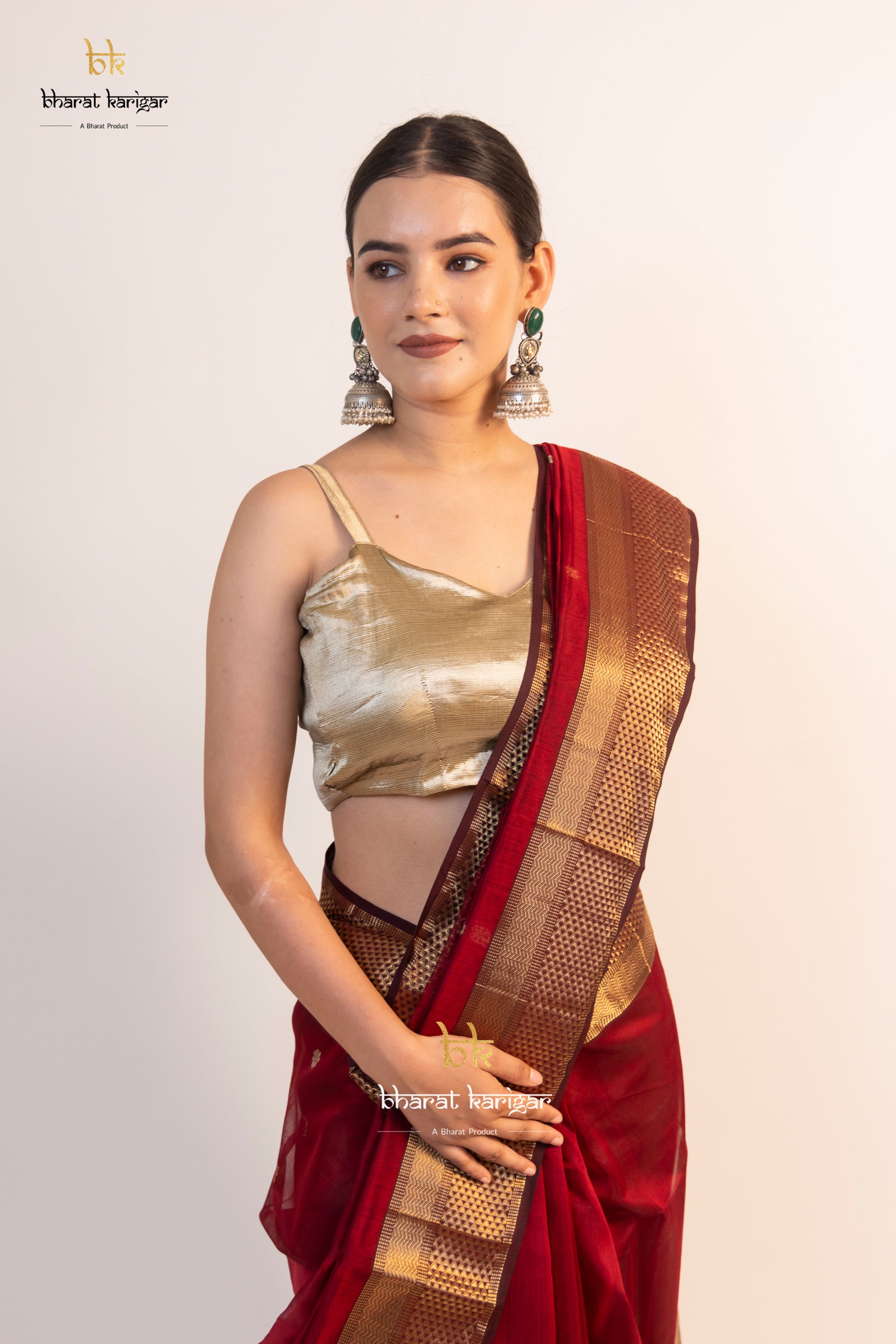 Maheshwari Handwoven Zari Border Sarees Size Length x Width: 6.3 meter x 46inches Blouse piece: Attached: 80 c.mMaterial 50% Silk - Warp || 50% cotton - Weft