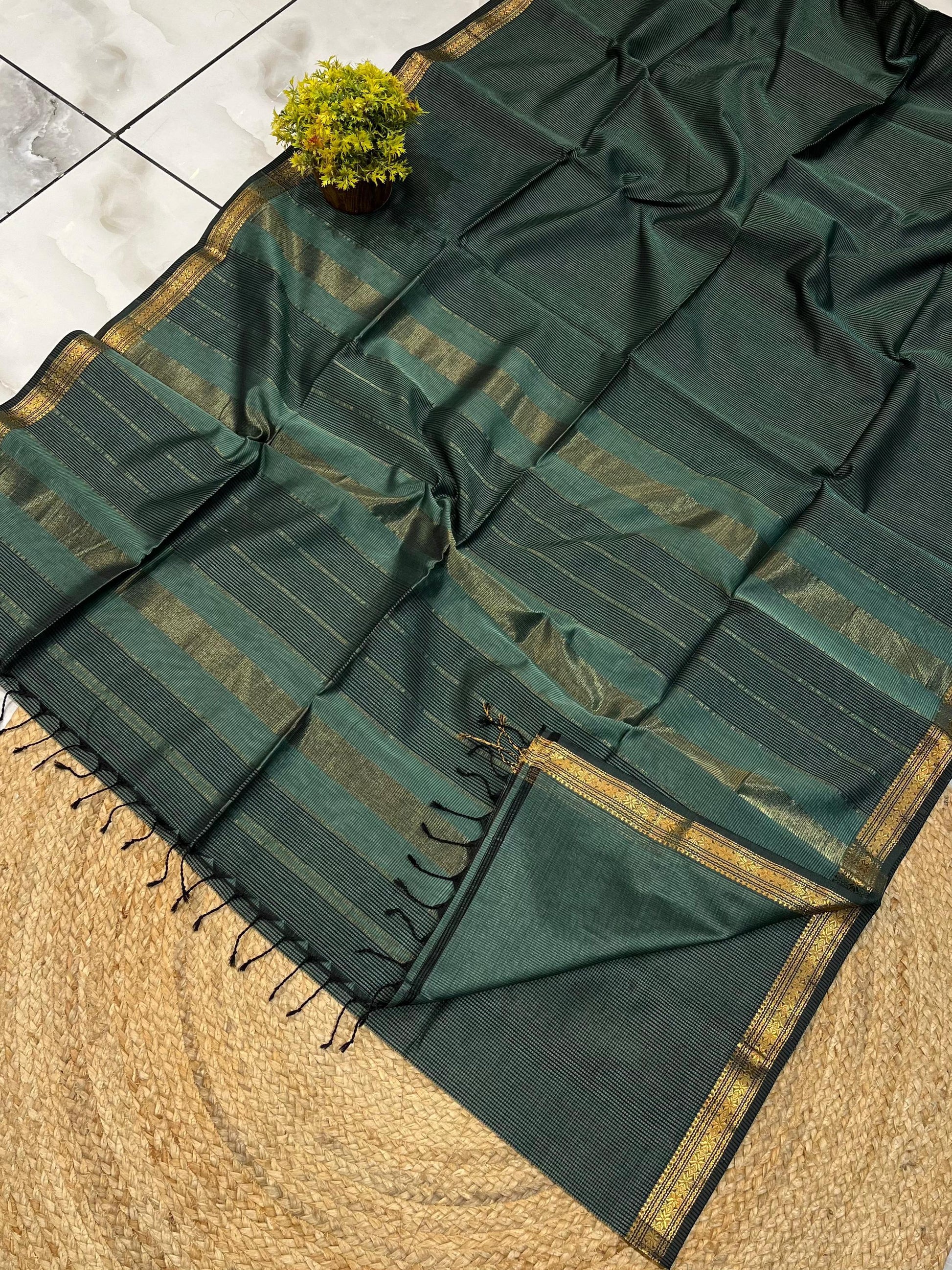 Maheshwari Handwoven Zari Border Sarees Size Length x Width: 6.3 meter x 46inches Blouse piece: Attached: 80 c.mMaterial 50% Silk - Warp || 50% cotton - Weft