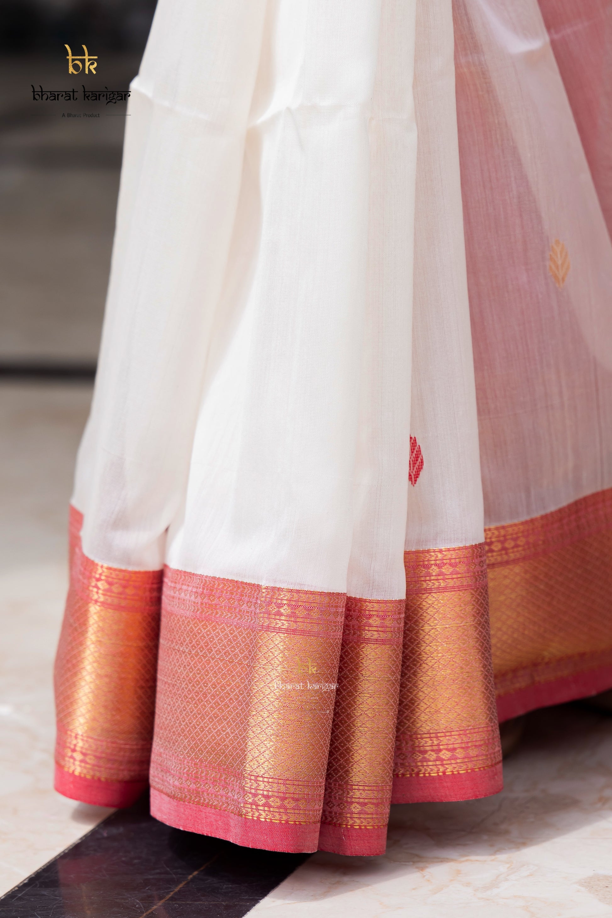 Maheshwari Handwoven Zari Border Sarees Size Length x Width: 6.3 meter x 46inches Blouse piece: Attached: 80 c.mMaterial 50% Silk - Warp || 50% cotton - Weft