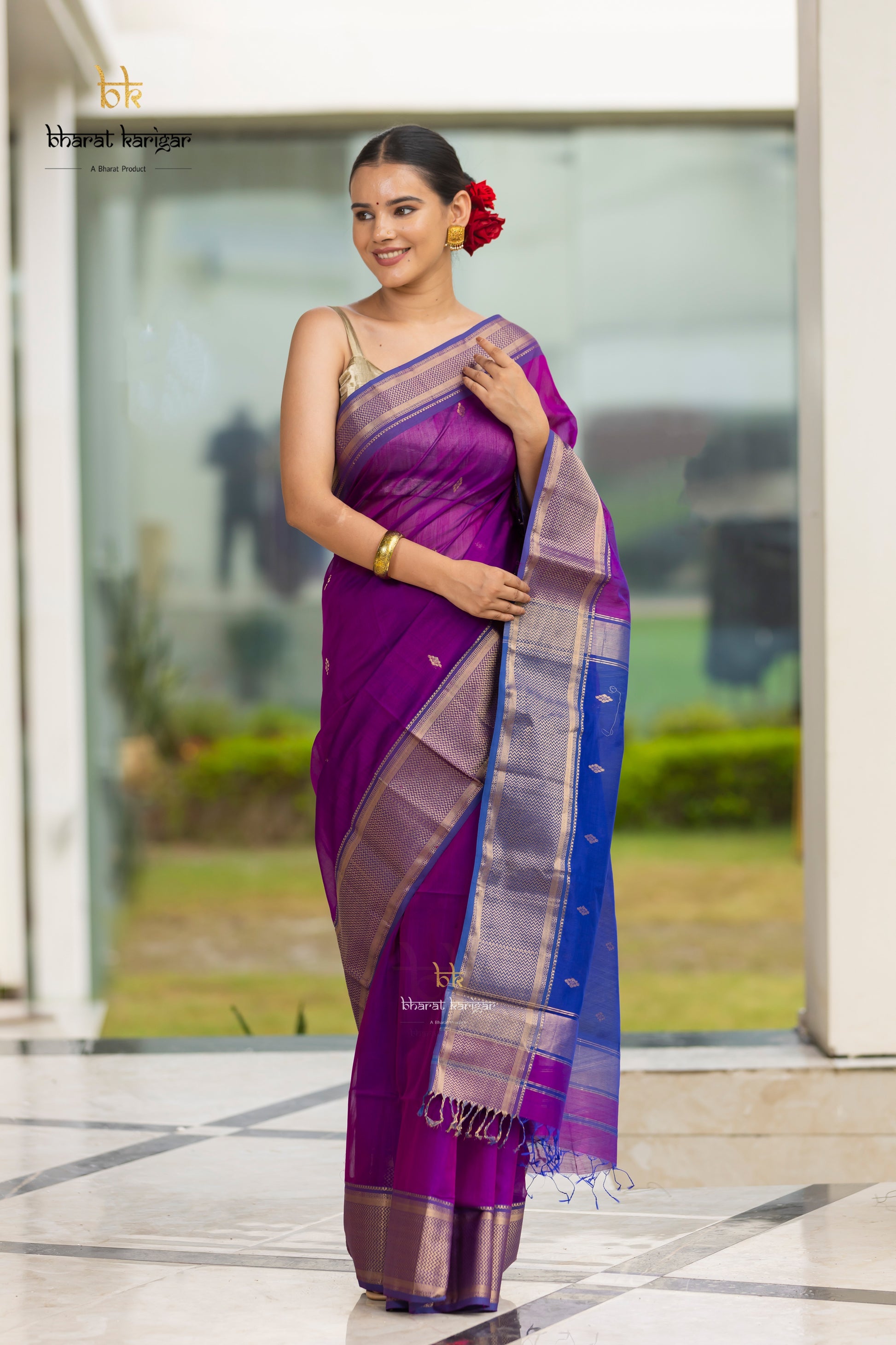 Maheshwari Handwoven Zari Border Sarees Size Length x Width: 6.3 meter x 46inches Blouse piece: Attached: 80 c.mMaterial 50% Silk - Warp || 50% cotton - Weft